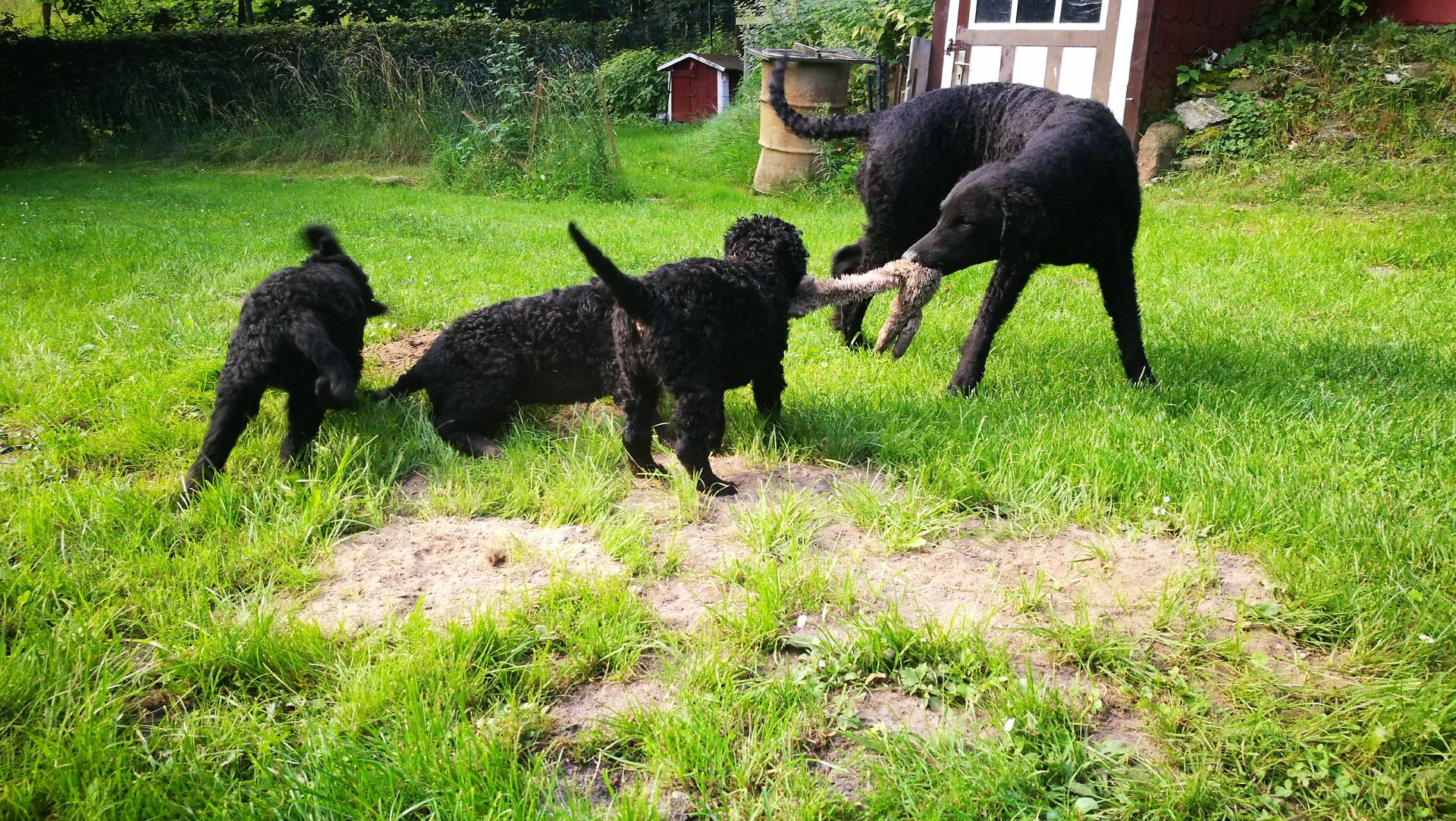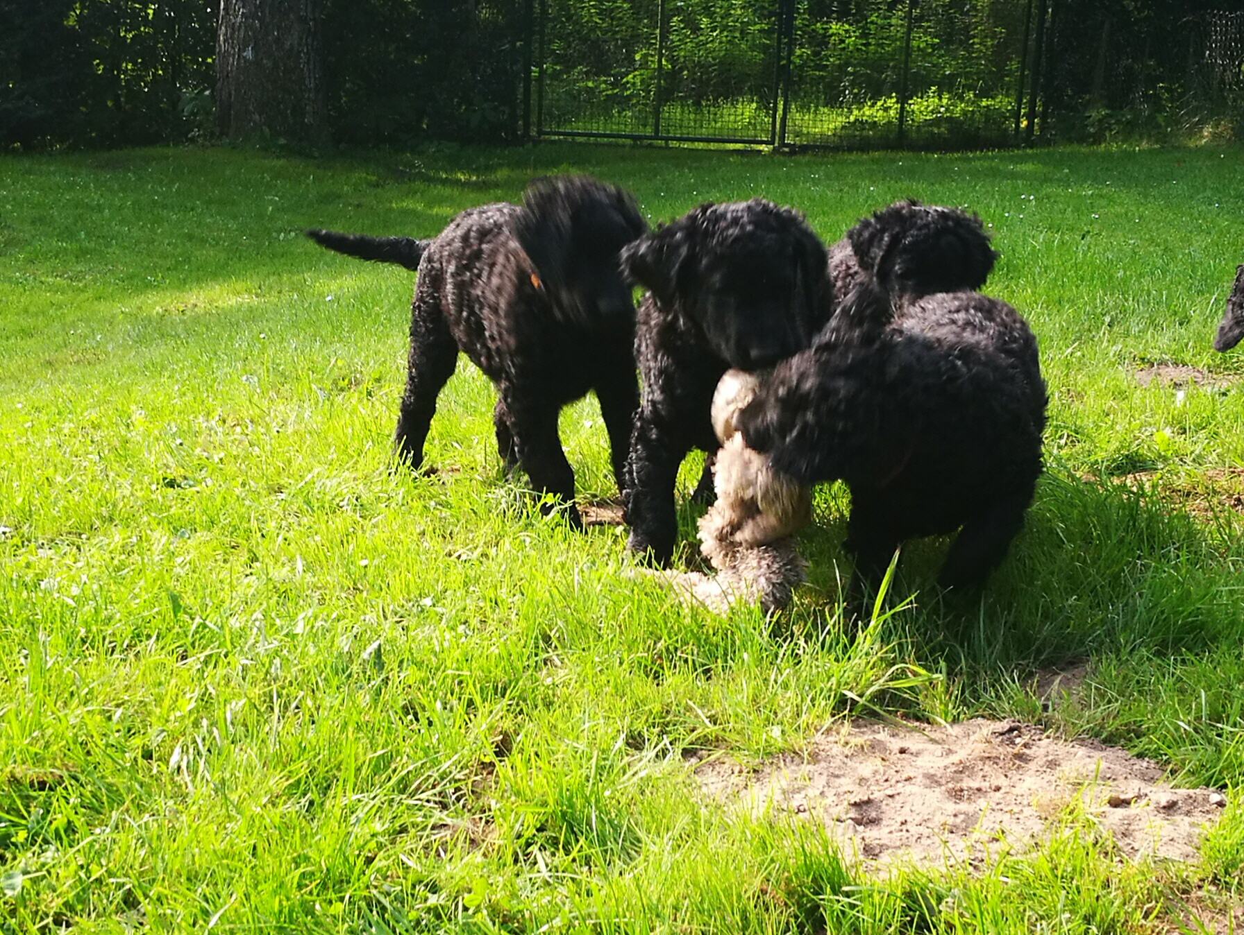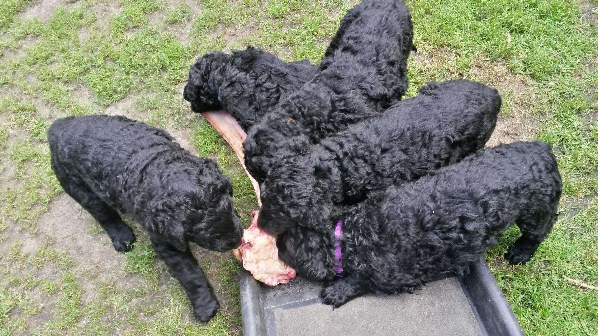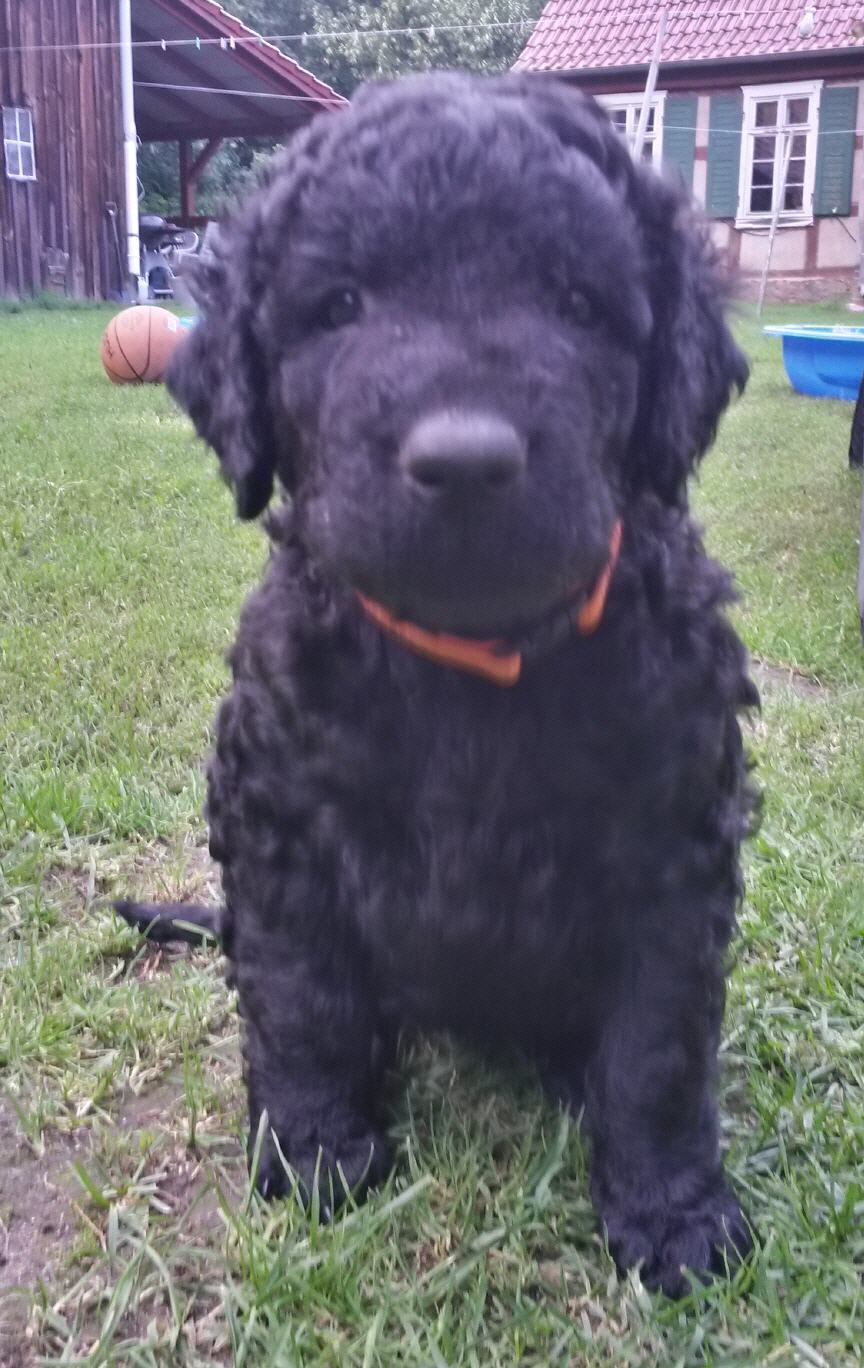Gestern am 27.06. waren unsere 5 kleinen Lockenbabies nun schon 4 Wochen. Die Zeit vergeht so schnell und sie entdecken die Welt jeden Tag mehr. Mittlerweile fressen sie nicht nur Schabefleischbällchen zur Nacht, sondern auch 3 x täglich Welpenbrei mit Ziegenmilch. Das bekommt und schmeckt ihnen sehr gut. Jeder hat seinen kleinen Napf und so wird schön in Ruhe aufgeschleckt. Sie haben die Wurfkiste meistens nur noch zum Schlafen. Der Weg zur Stubenreinheit ist auch schon geebnet. Sie gehen für das Häufchen sogar schon raus ins Freie. Das Durchschnittsgewicht liegt mittlerweile bei guten 3,2 kg. Sie haben jetzt noch mehr Spielzeug bekommen, was sie auch schon sehr schön annehmen und sogar schon, wie richtige kleine Retriever durch die Gegend tragen. Den Doppelpfiff haben sie auch schon kennengelernt und so kommen sie nun schon fast selbständig zum Futter. Dieses mal gibt es auch die ersten Einzelfotos als Sitz- und Standfoto, was natürlich für uns alle ein Versuch war und so hoffen wir, dass es in der nächsten Woche besser aussehen wird. Einige sind aber recht talentiert.
