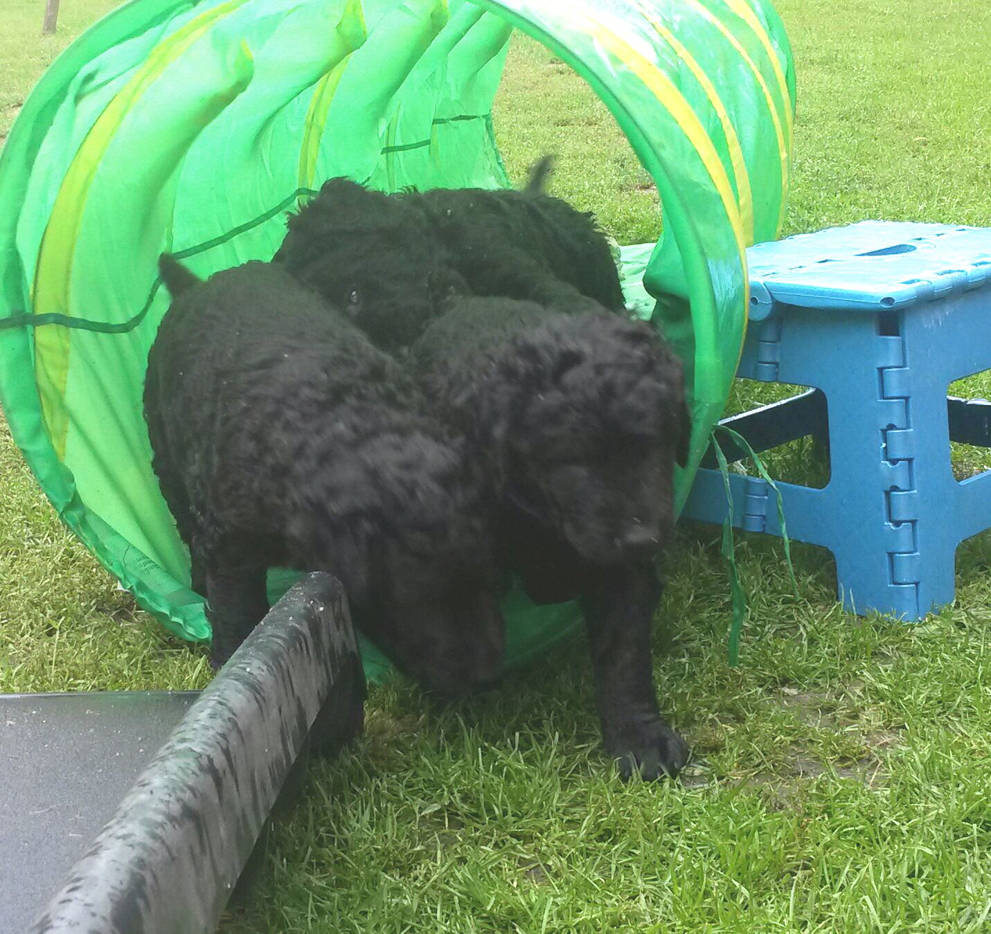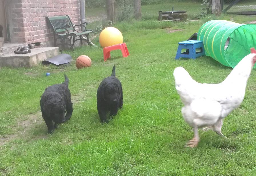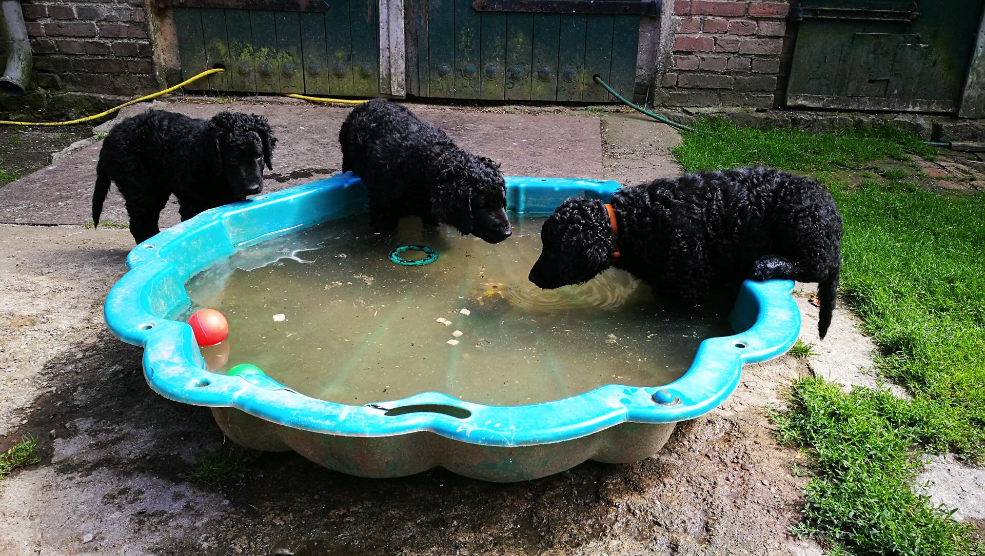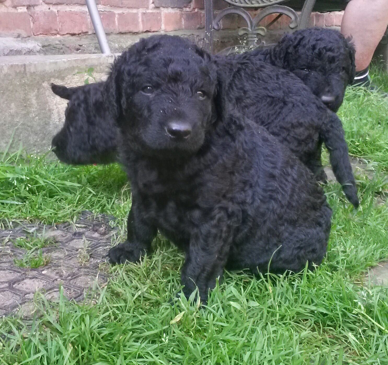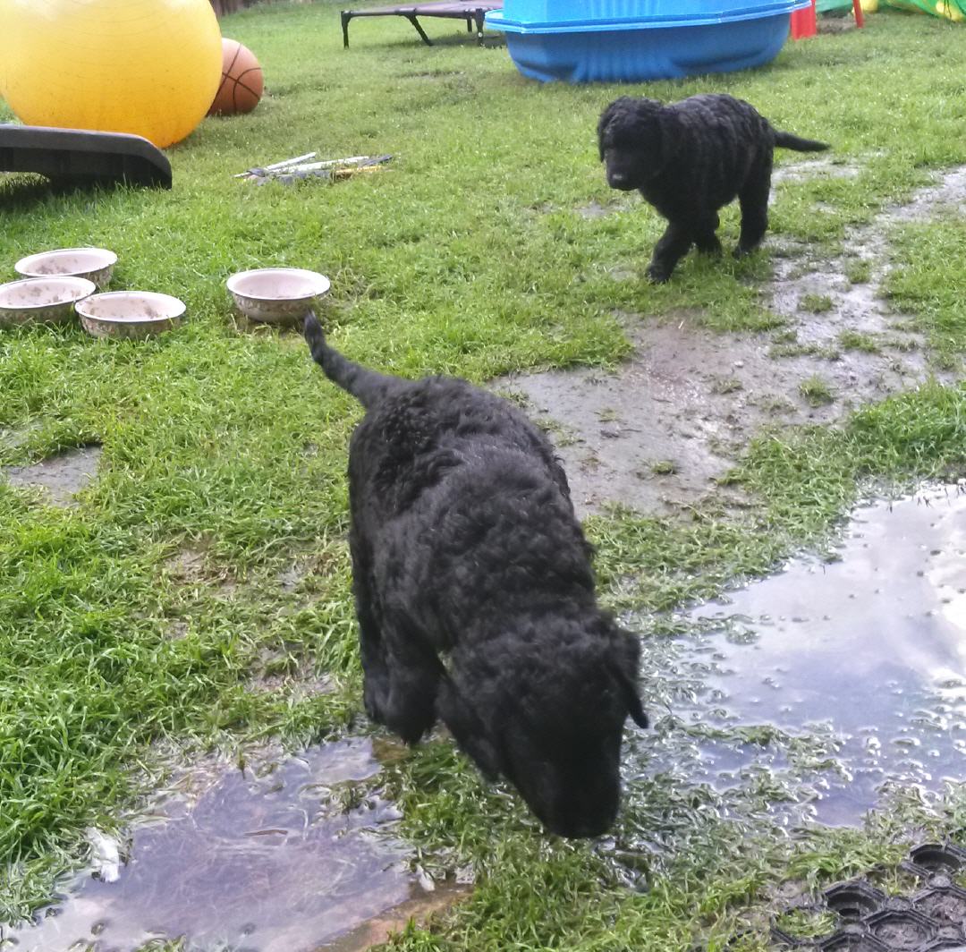Gestern am 27.06. waren unsere 5 kleinen Lockenbabies nun schon 4 Wochen. Die Zeit vergeht so schnell und sie entdecken die Welt jeden Tag mehr. Mittlerweile fressen sie nicht nur Schabefleischbällchen zur Nacht, sondern auch 3 x täglich Welpenbrei mit Ziegenmilch. Das bekommt und schmeckt ihnen sehr gut. Jeder hat seinen kleinen Napf und so wird schön in Ruhe aufgeschleckt. Sie haben die Wurfkiste meistens nur noch zum Schlafen. Der Weg zur Stubenreinheit ist auch schon geebnet. Sie gehen für das Häufchen sogar schon raus ins Freie. Das Durchschnittsgewicht liegt mittlerweile bei guten 3,2 kg. Sie haben jetzt noch mehr Spielzeug bekommen, was sie auch schon sehr schön annehmen und sogar schon, wie richtige kleine Retriever durch die Gegend tragen. Den Doppelpfiff haben sie auch schon kennengelernt und so kommen sie nun schon fast selbständig zum Futter. Dieses mal gibt es auch die ersten Einzelfotos als Sitz- und Standfoto, was natürlich für uns alle ein Versuch war und so hoffen wir, dass es in der nächsten Woche besser aussehen wird. Einige sind aber recht talentiert.