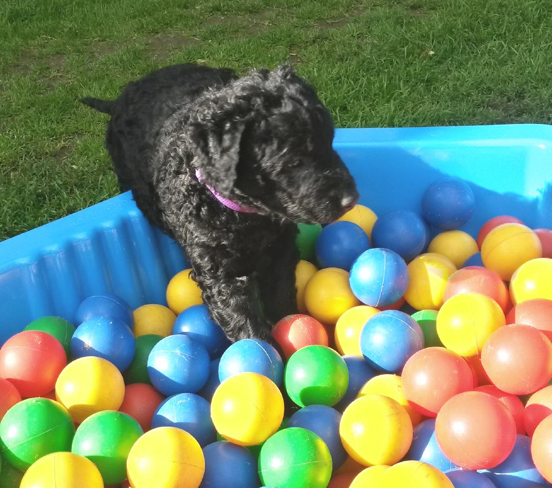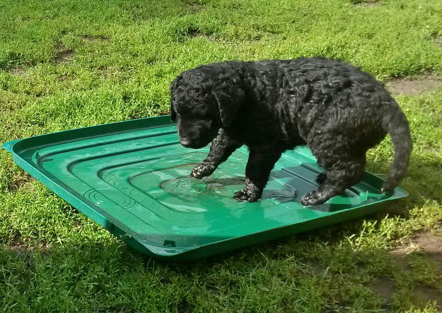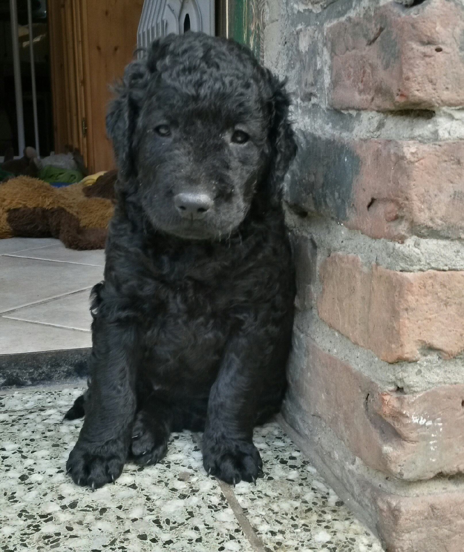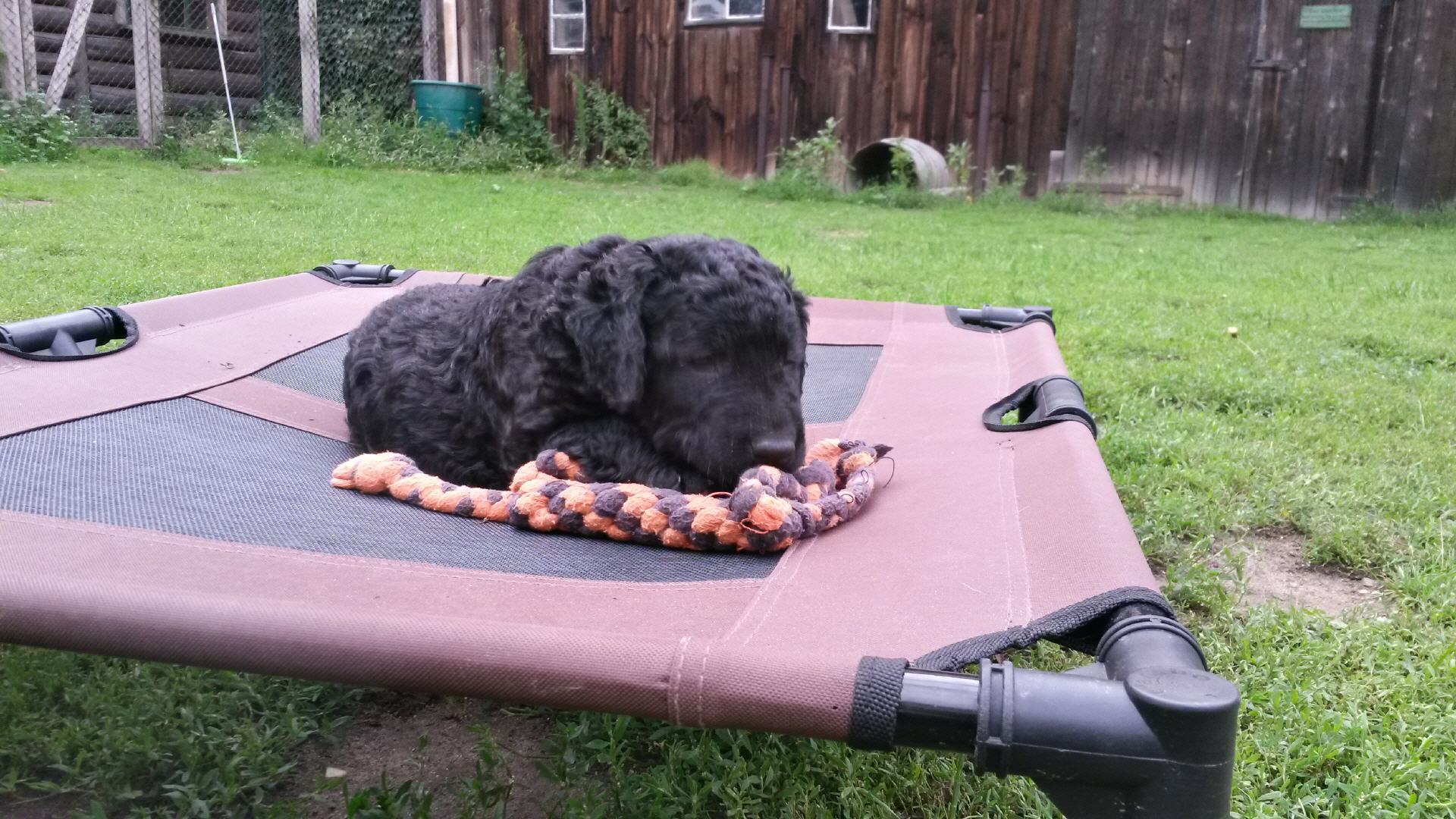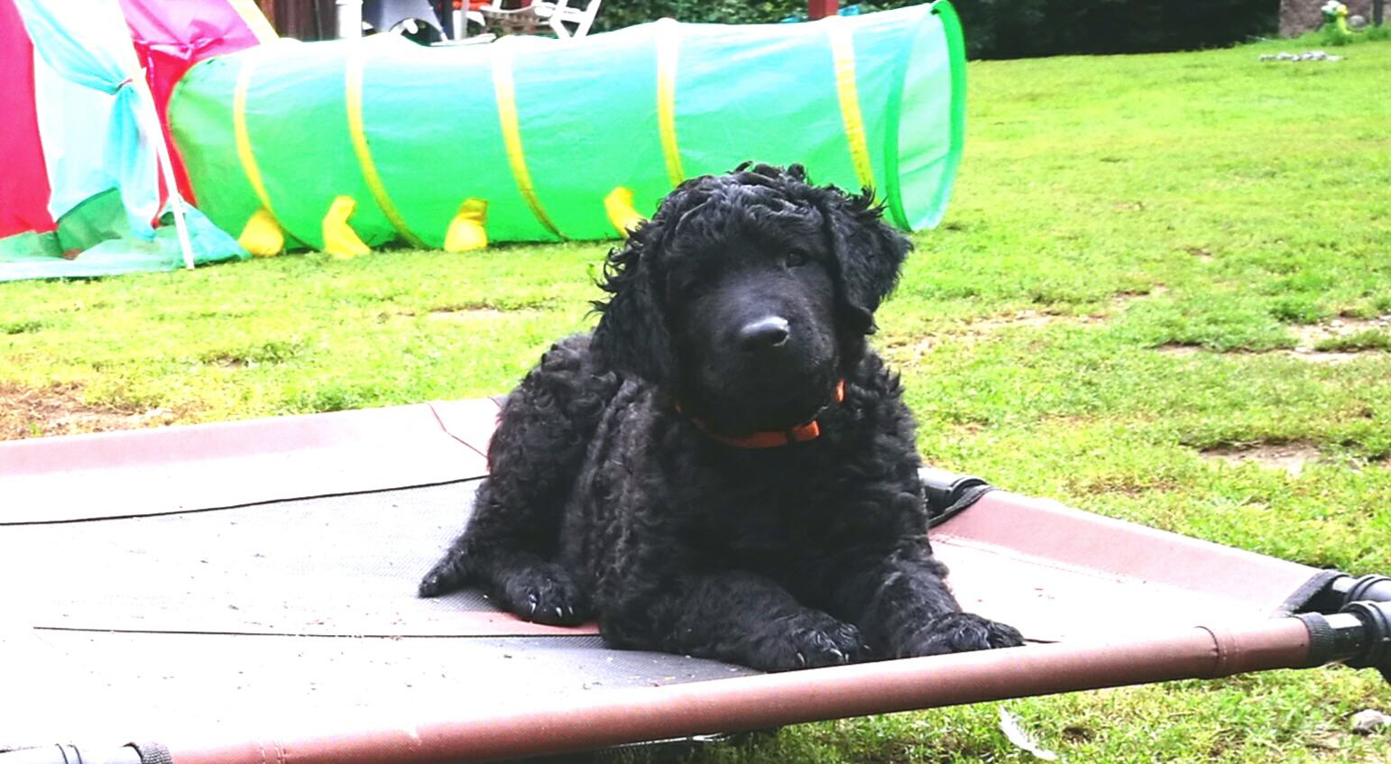 Gestern am 27.06. waren unsere 5 kleinen Lockenbabies nun schon 4 Wochen. Die Zeit vergeht so schnell und sie entdecken die Welt jeden Tag mehr. Mittlerweile fressen sie nicht nur Schabefleischbällchen zur Nacht, sondern auch 3 x täglich Welpenbrei mit Ziegenmilch. Das bekommt und schmeckt ihnen sehr gut. Jeder hat seinen kleinen Napf und so wird schön in Ruhe aufgeschleckt. Sie haben die Wurfkiste meistens nur noch zum Schlafen. Der Weg zur Stubenreinheit ist auch schon geebnet. Sie gehen für das Häufchen sogar schon raus ins Freie. Das Durchschnittsgewicht liegt mittlerweile bei guten 3,2 kg. Sie haben jetzt noch mehr Spielzeug bekommen, was sie auch schon sehr schön annehmen und sogar schon, wie richtige kleine Retriever durch die Gegend tragen. Den Doppelpfiff haben sie auch schon kennengelernt und so kommen sie nun schon fast selbständig zum Futter. Dieses mal gibt es auch die ersten Einzelfotos als Sitz- und Standfoto, was natürlich für uns alle ein Versuch war und so hoffen wir, dass es in der nächsten Woche besser aussehen wird. Einige sind aber recht talentiert.