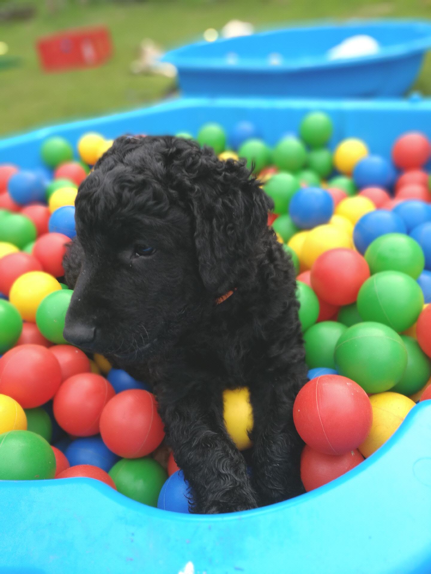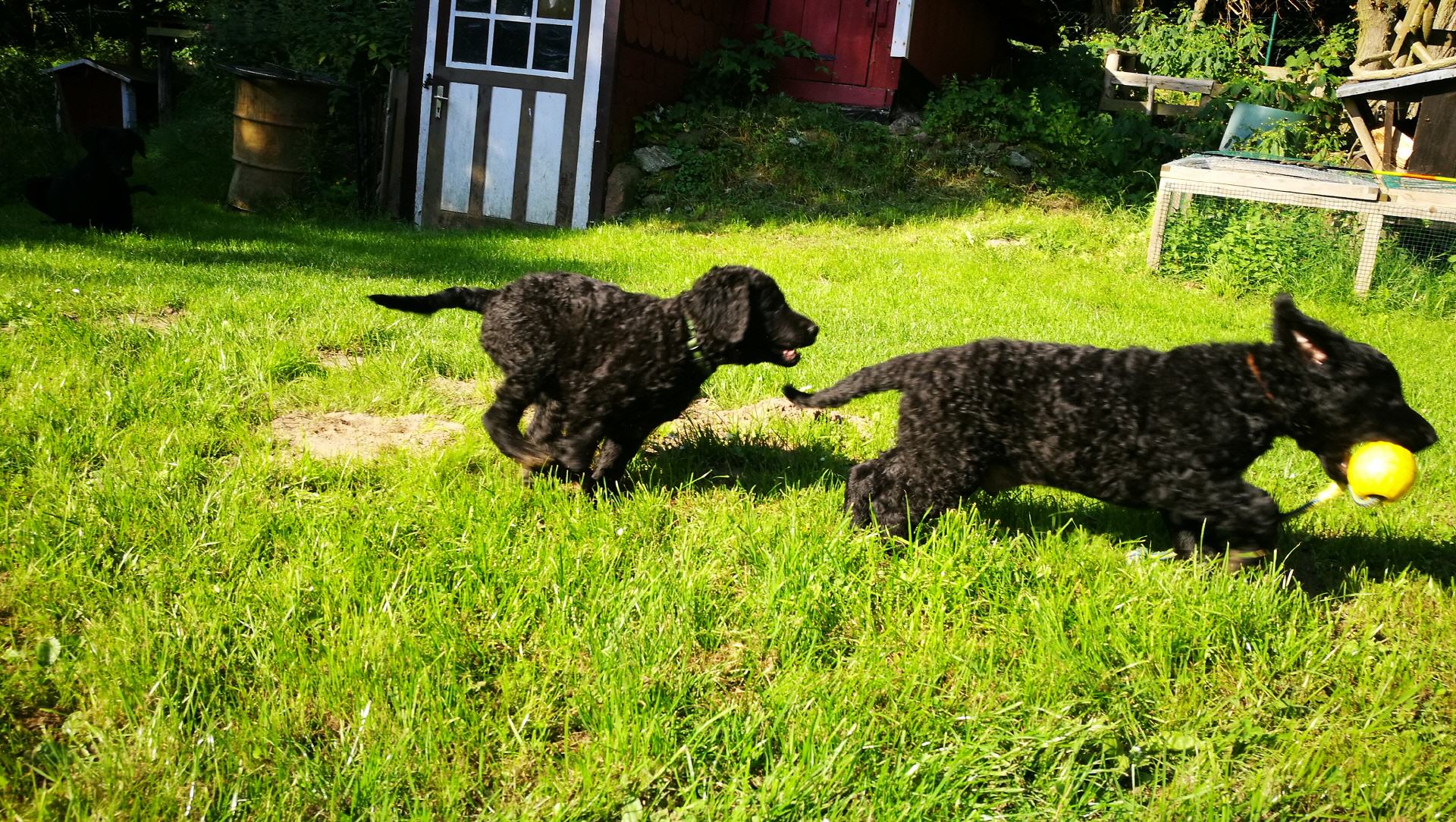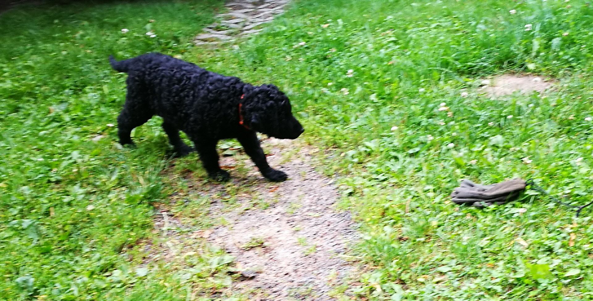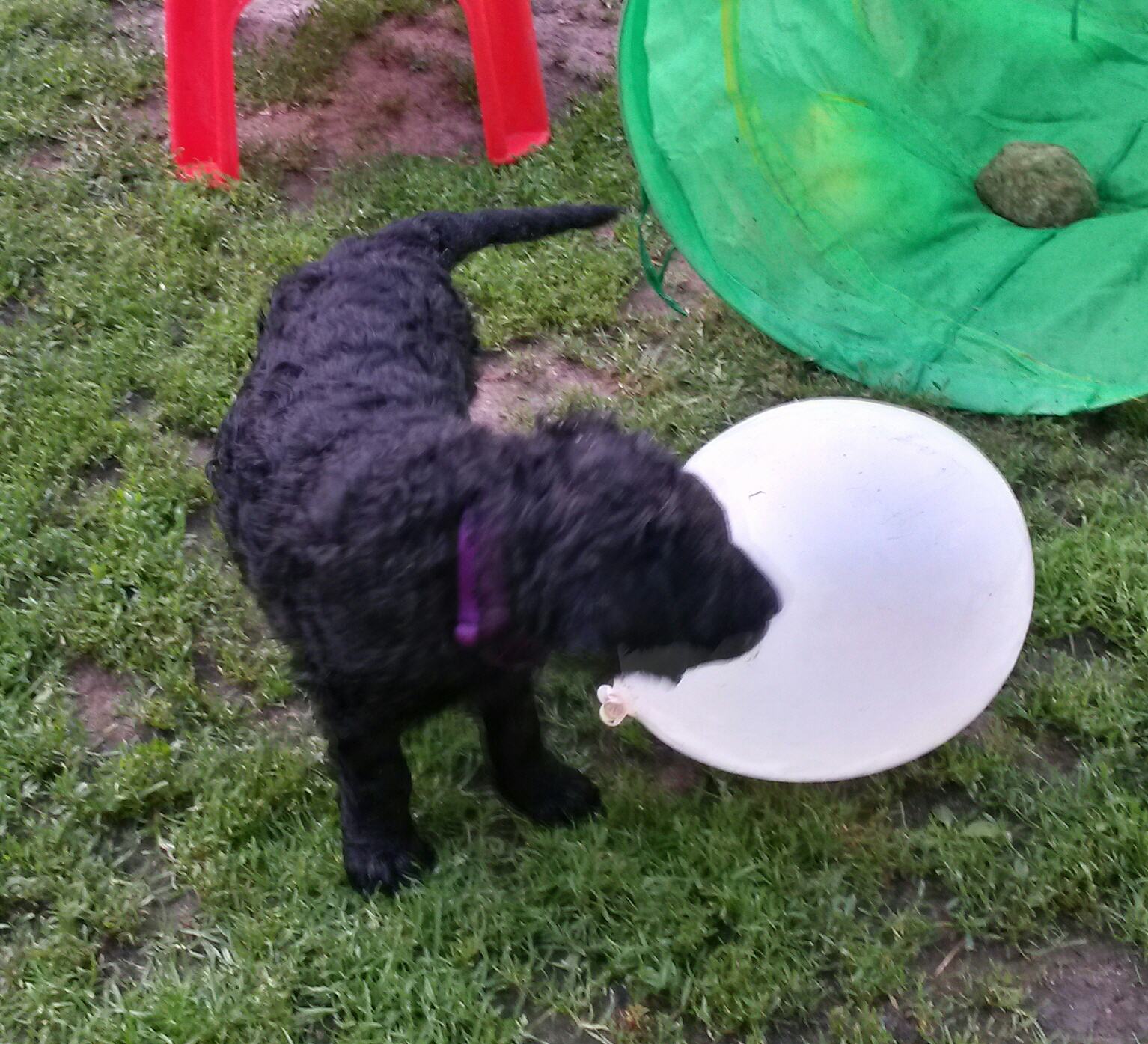 Gestern am 27.06. waren unsere 5 kleinen Lockenbabies nun schon 4 Wochen. Die Zeit vergeht so schnell und sie entdecken die Welt jeden Tag mehr. Mittlerweile fressen sie nicht nur Schabefleischbällchen zur Nacht, sondern auch 3 x täglich Welpenbrei mit Ziegenmilch. Das bekommt und schmeckt ihnen sehr gut. Jeder hat seinen kleinen Napf und so wird schön in Ruhe aufgeschleckt. Sie haben die Wurfkiste meistens nur noch zum Schlafen. Der Weg zur Stubenreinheit ist auch schon geebnet. Sie gehen für das Häufchen sogar schon raus ins Freie. Das Durchschnittsgewicht liegt mittlerweile bei guten 3,2 kg. Sie haben jetzt noch mehr Spielzeug bekommen, was sie auch schon sehr schön annehmen und sogar schon, wie richtige kleine Retriever durch die Gegend tragen. Den Doppelpfiff haben sie auch schon kennengelernt und so kommen sie nun schon fast selbständig zum Futter. Dieses mal gibt es auch die ersten Einzelfotos als Sitz- und Standfoto, was natürlich für uns alle ein Versuch war und so hoffen wir, dass es in der nächsten Woche besser aussehen wird. Einige sind aber recht talentiert.
