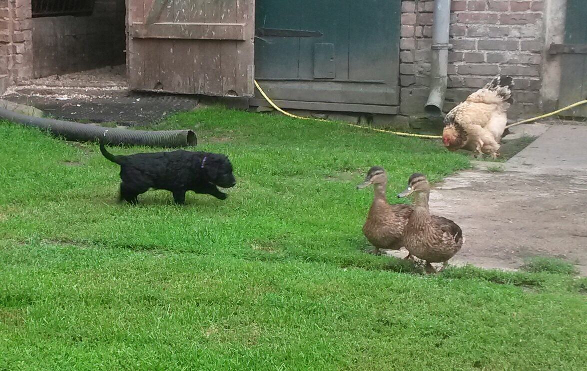 Heute ist der 12.07. , die Kleinen sind 6 Wochen alt und endlich schaffe ich hier Staub zu wischen und neue Fotos von unserer kleinen Rasselbande einzustellen. Sie sind kräftig gewachsen, haben den Hof erobert, Enten und Hühner kennengelernt. Sie gehen schon mit den Füßen in die bereit gestellten Wasserstellen und baden liebend gern im Bällebad. Mittlerweile hören sie schon schön auf den Kommpfiff, da es dann immer Futter gibt und stubenrein sind sie auch schon fast. Sie zeigen gutes jagdliches Interesse und können schon stolz tragen.